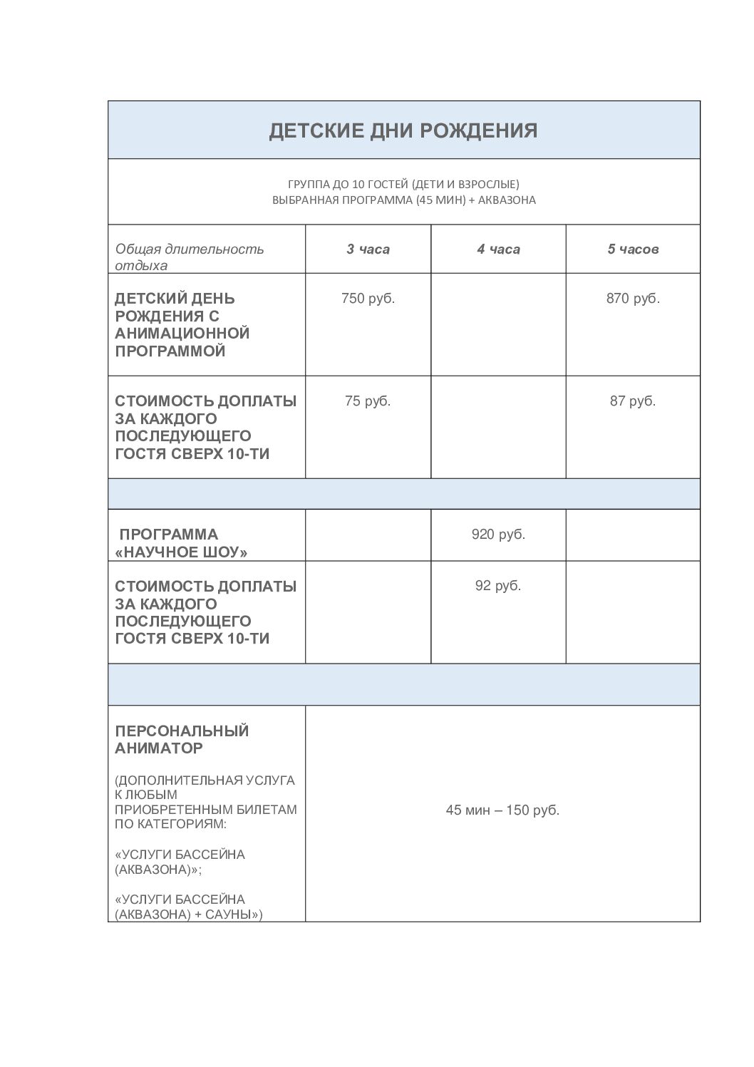 *Оплата пакетов услуг производится в день посещения на кассах второго этажа развлекательного комплекса «Аквапарк «Лебяжий».